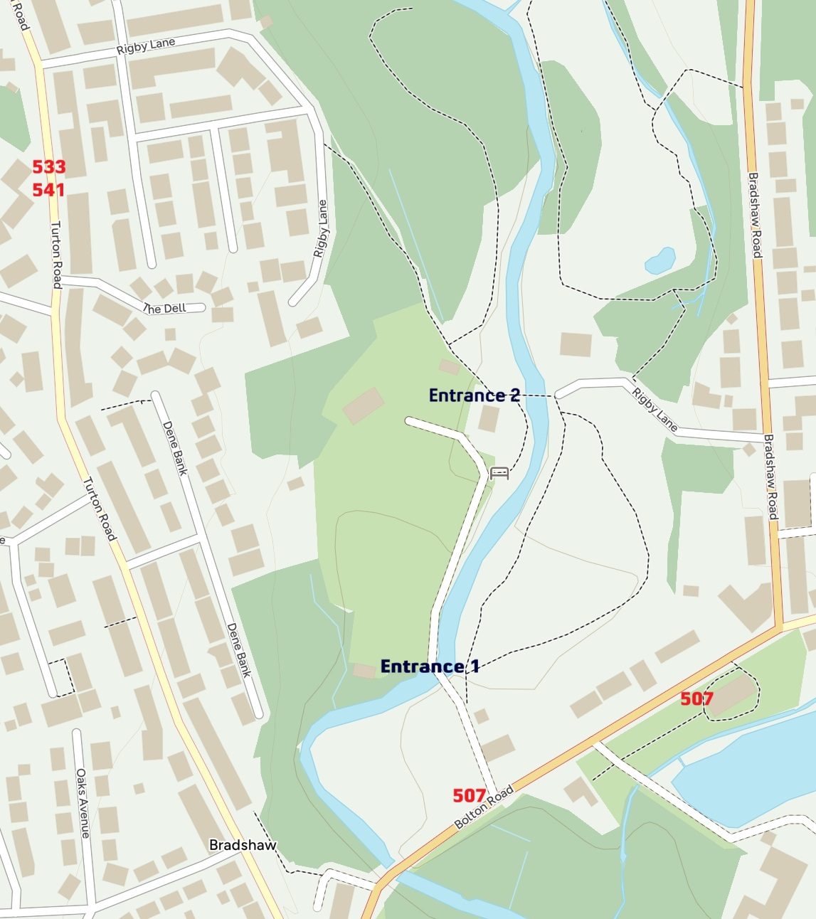 Entrance 2 can be accessed from either Turton Road or Bradshaw Road via Rigby Lane – The 533 & 541 buses from Bromley Cross and Egerton stop on Turton Road close to Rigby Lane.